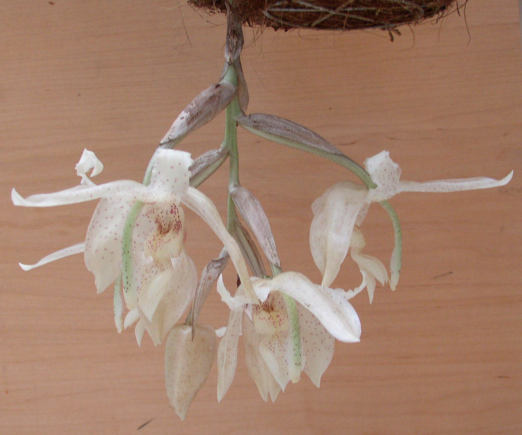 "Eleven cream flowers with red flecking on two inflorescences; lip with flecking darker and denser near base; flowers rather closely spaced, petals reflexed into a tail, sepal margins rolled back, texture dull except for waxy lip, substance rubbery. Natural spread of flower 10.9 cm; dorsal sepal 3.2 cm wide, 6.9 cm long; petals 1.7 cm wide, 5.1 cm long; lateral sepals 3.6 cm wide, 6.5 cm long; lip 2.4 cm wide, 5.9 cm long."