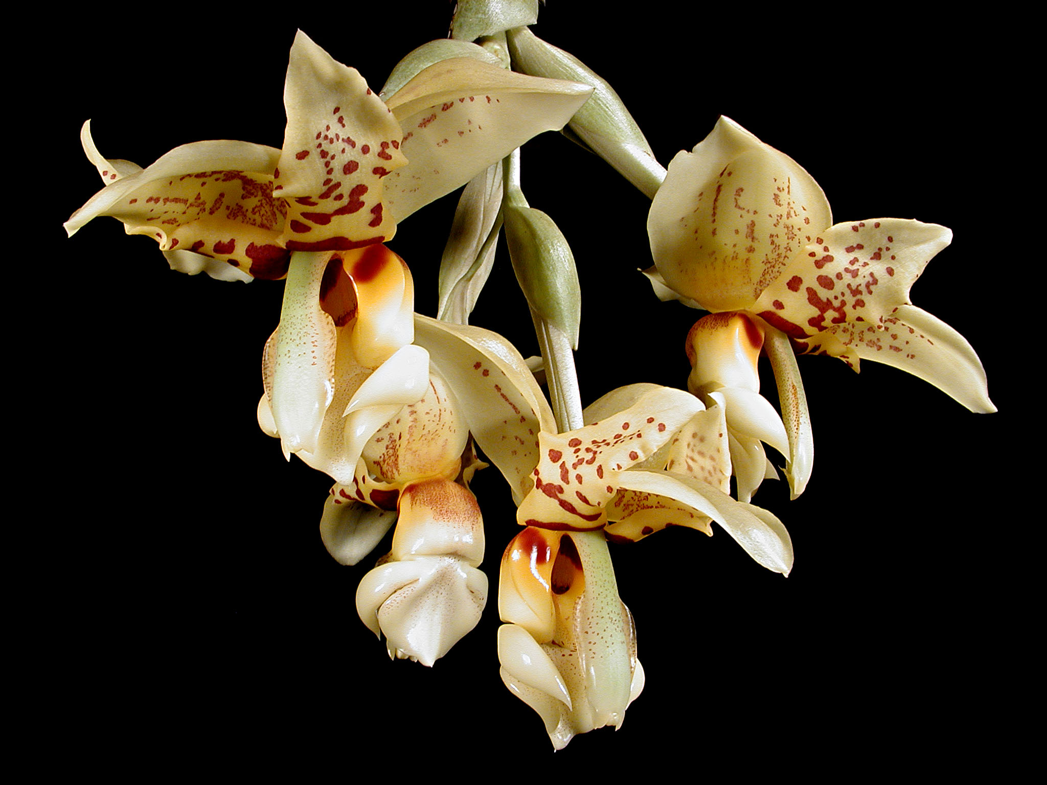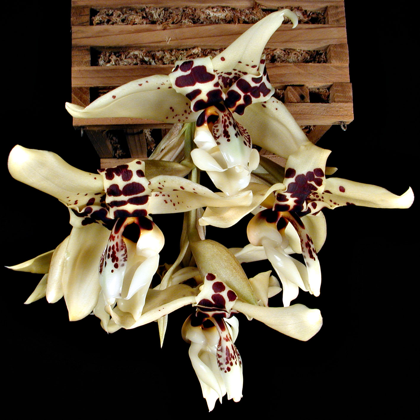 This list includes the six natural Stanhopea hybrids, 90 RHS-registered Stanhopea hybrids, 1 Acinbrea, 2 Aciopeas, 1 Cirrhopea, 10 Coryhopeas, 1 Gongorhaea, 1 Polygora, 3 Stanbreas, 3 Stangoras, and 1 Stanhocycnis.